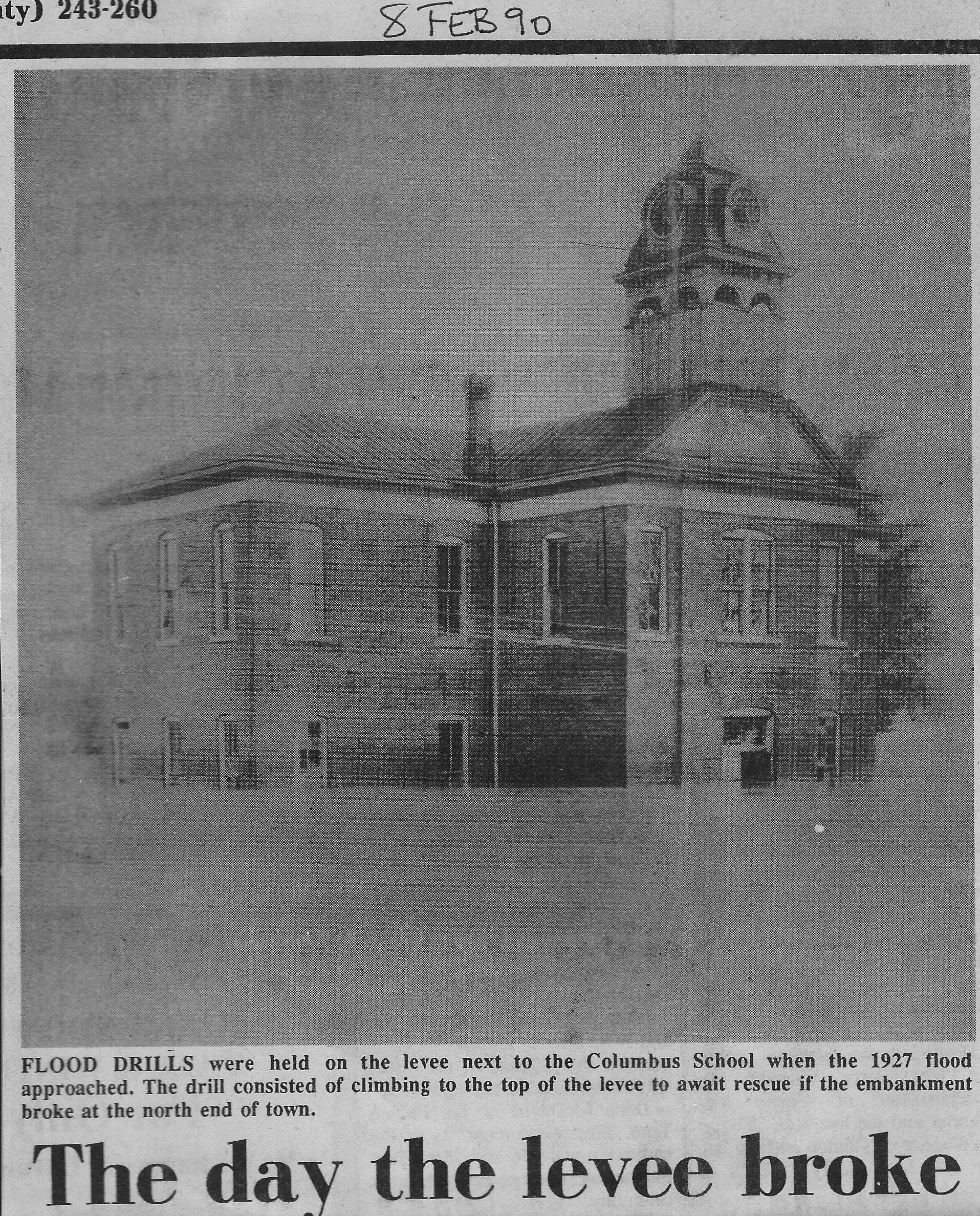 After the 1912 flood, the existing levee at Columbus had been enlarged at great cost. It was 12 feed high at the south end of town and 12 feed wide at the base. Its six-foot wide top was used as a walkway.